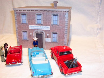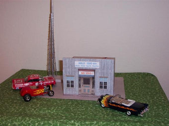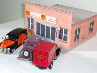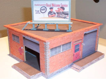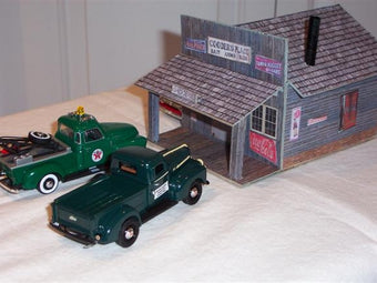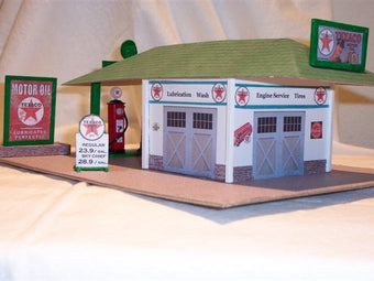 "Here's my 2nd Model Builder Building (an adaptation of your Service Station Plans (with some bass wood additions ). The Texaco wrecker truck is 1/43 scale, and so are the gas pumps as well. The signs I constructed from signs printed off the internet." Elliott