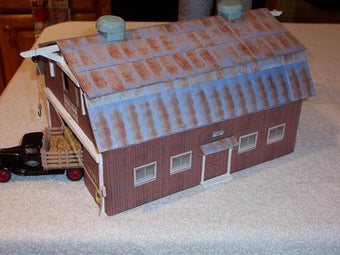"I designed my own dairy barn. Photos are attached for your review. Again, a little Bass wood, paint and a few clothing snaps & waxed linen thread helped add the detail. The 1/43 scale truck was a recent purchase. It's an Ertl Vintage Vehicles 1930 Chevy Stake Truck" Elliott