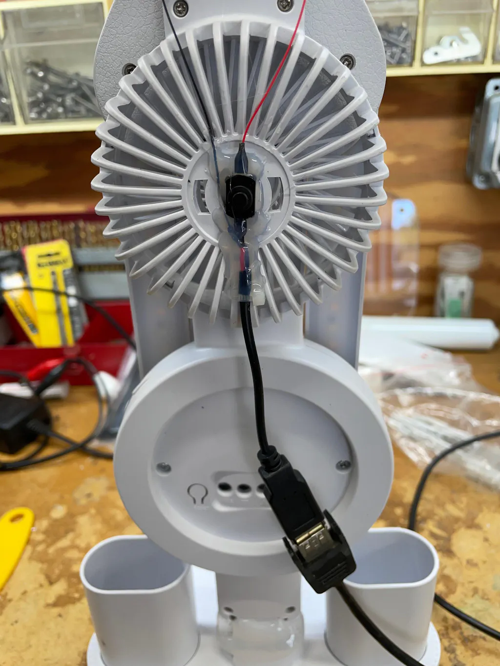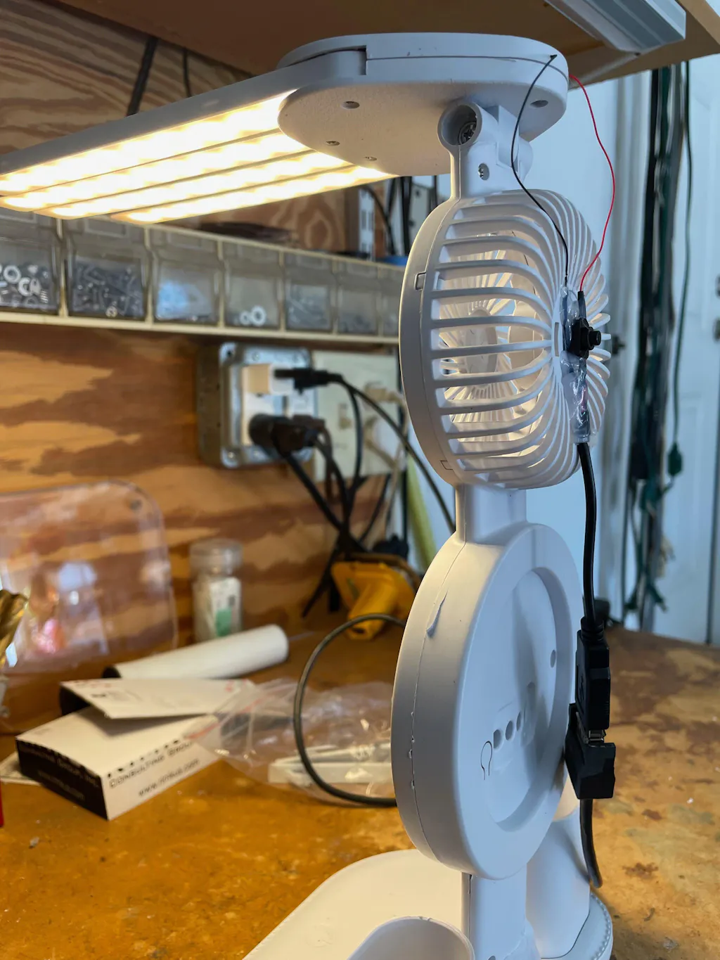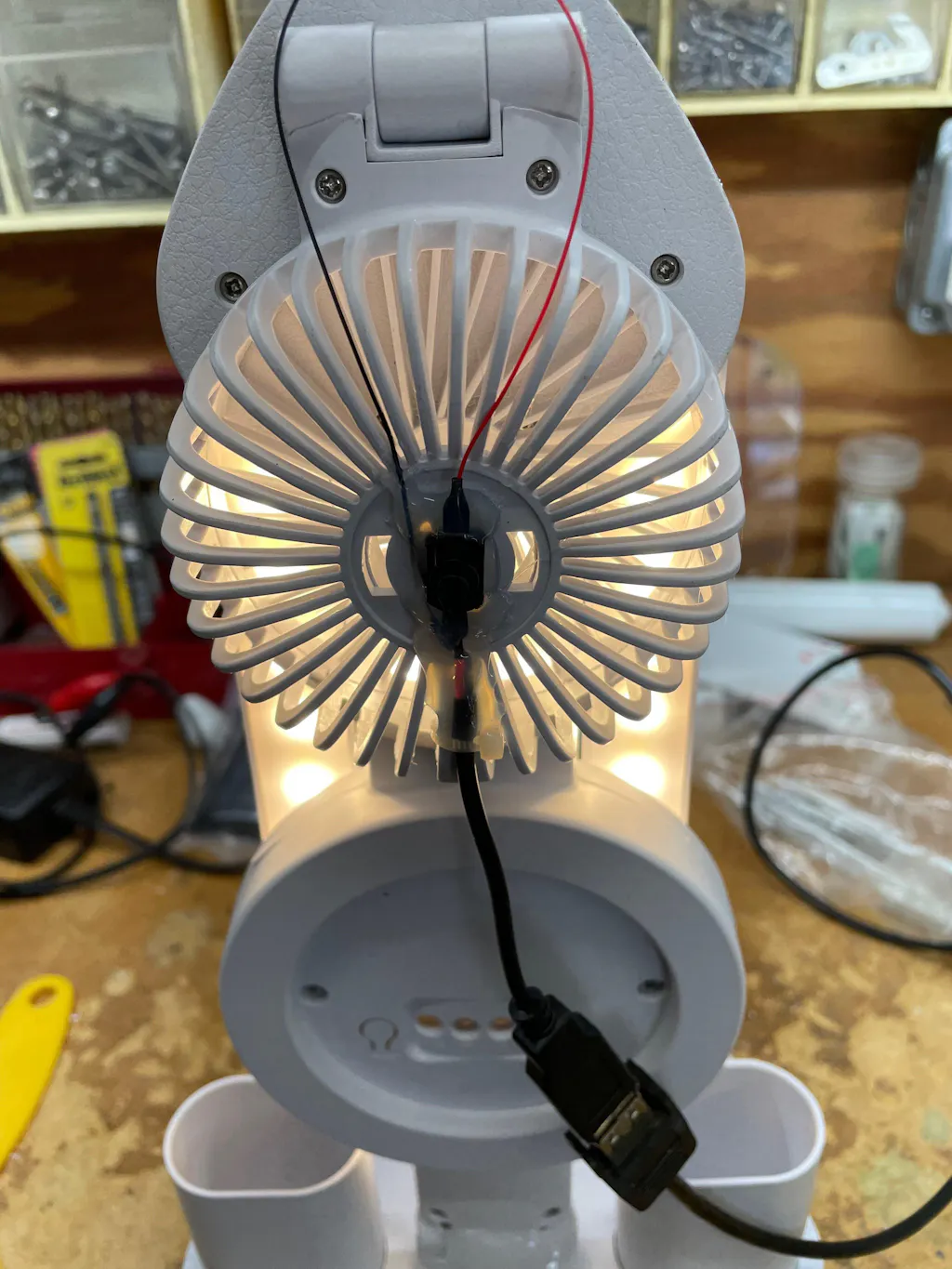 This USB connector has a red wire and a black wire. All of our LEDs have a red wire and either a black or green wire. To connect, twist the red to red, and black to black/green.